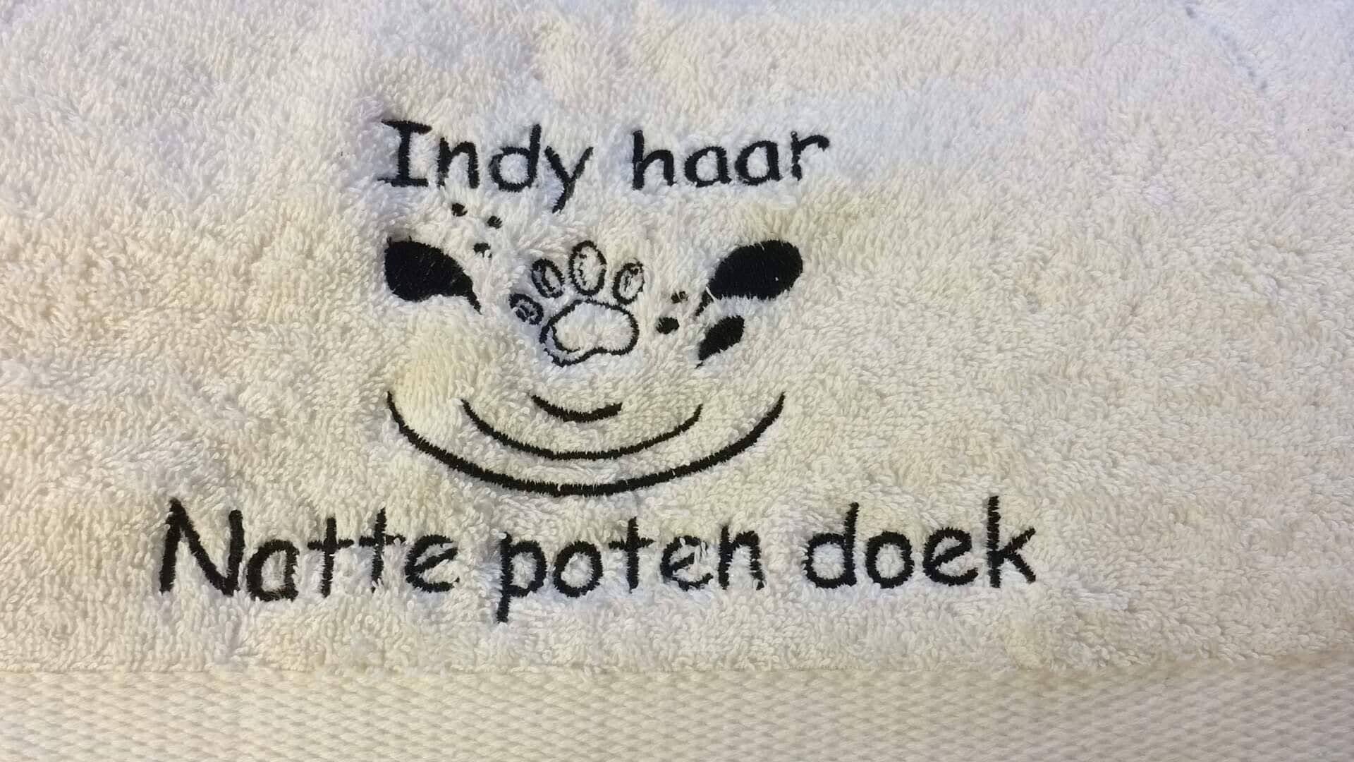 Mooie kwaliteitvolle handdoek die je speciaal reserveerd om je hond goed af te drogen als hij weer binnenkomt van een wandeling in de regen.