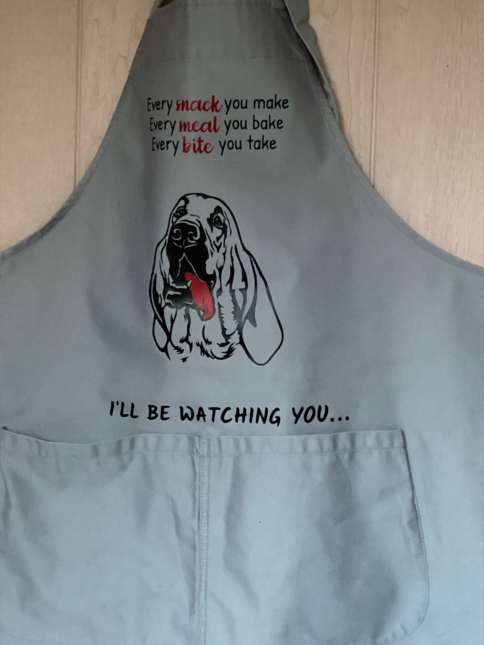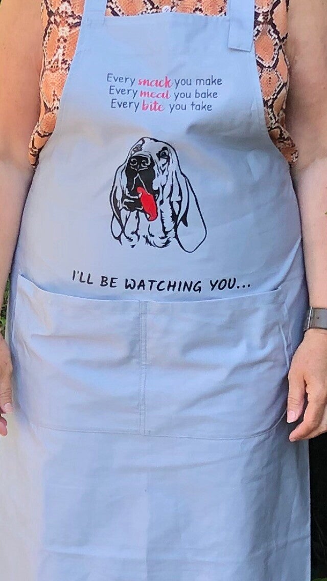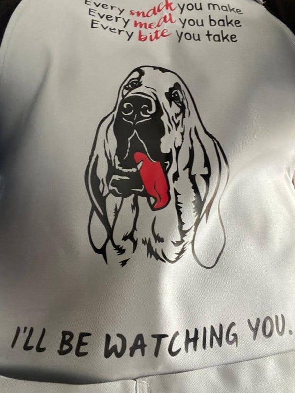 Keukenschort bedrukt met een leuke tekst en een bloedhond of een afbeelding van een ander ras. Heel leuk voor aan de BBQ of om iemand cadeau te geven.